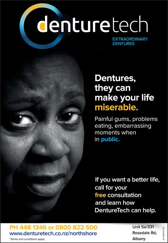 denturetech EXTRAORDINARY DENTURES Dentures, they can make your life miserable. Painful gums, problems eating, embarrassing moments when in public. If you want a better life, call for your free consultation and learn how DentureTech can help. PH 448 1346 or 0800 822 500 www.denturetech.co.nz/northshore Terms and conditions apply Unit 5a/331 Rosedale Rd, Albany