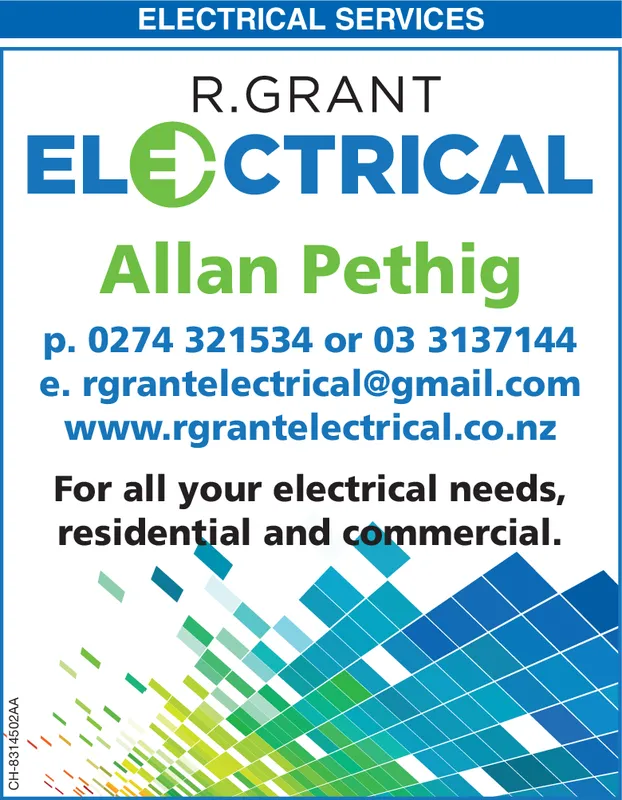 ELECTRICAL SERVICES R. GRANT ELECTRICAL Allan Pethig p. 0274 321534 or 03 3137144 e. rgrantelectrical@gmail.com www.rgrantelectrical.co.nz For all your electrical needs, residential and commercial.