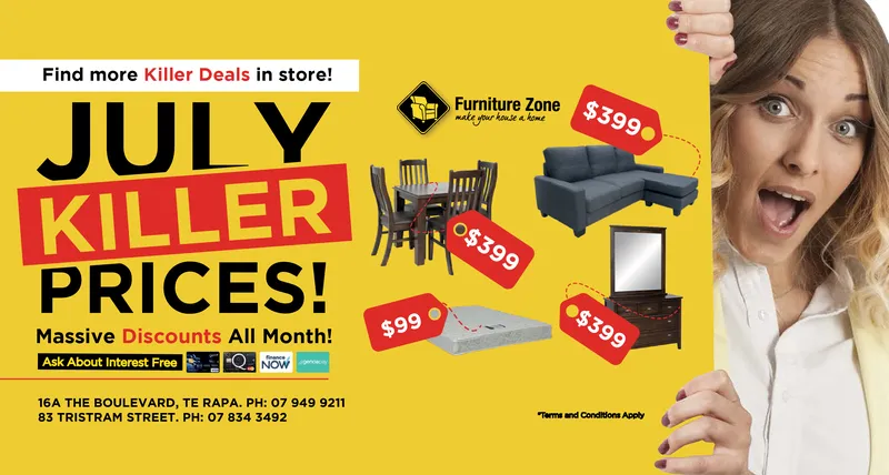 Find more Killer Deals in store! $399. Furniture Zone JULY KILLER PRICES IIIL O$399 $399 $99 . Massive Discounts All Month! NOW Ask About Interest Free 16A THE BOULEVARD, TE RAPA. PH: 07 949 9211 83 TRISTRAM STREET. PH: 07 834 3492 Tors and Conditiona Apply