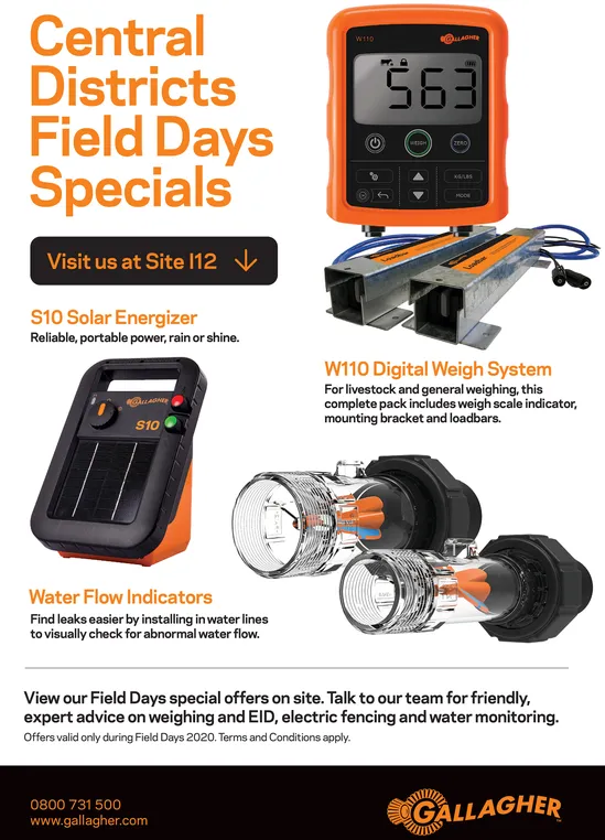 Central Districts Field Days Specials BLAGHIS 563 Visit us at Site 12 V S10 Solar Energizer Reliable, portable power, rain or shine. W110 Digital Weigh System For livestock and general weighing, this complete pack includes weigh scale indicator, mounting bracket and loadbars. S10 Water Flow Indicators Find leaks easier by installing in water lines to visually check for abnormal water flow. View our Field Days special offers on site. Talk to our team for friendly, expert advice on weighing and EID, electric fencing and water monitoring. Offers valid only during Field Days 2020. Terms and Conditions apply. GALLAGHER 0800 731 500 www.gallagher.com Central Districts Field Days Specials BLAGHIS 563 Visit us at Site 12 V S10 Solar Energizer Reliable, portable power, rain or shine. W110 Digital Weigh System For livestock and general weighing, this complete pack includes weigh scale indicator, mounting bracket and loadbars. S10 Water Flow Indicators Find leaks easier by installing in water lines to visually check for abnormal water flow. View our Field Days special offers on site. Talk to our team for friendly, expert advice on weighing and EID, electric fencing and water monitoring. Offers valid only during Field Days 2020. Terms and Conditions apply. GALLAGHER 0800 731 500 www.gallagher.com