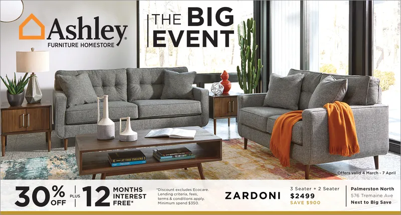 THE BIG Ashley | | EVENT FURNITURE HOMESTORE Offers valid 4 March- 7 April 30%+12MONTEST Discount excludes Ecocare. 3 Seater 2 SeaterHamilton INTEREST Lerns& condtions apply FREE tesc sun on ena sosoa ZARDONI $24990 5 Maui Street Next to Big Save OFF I Minimum spend $350 SAVE $900
