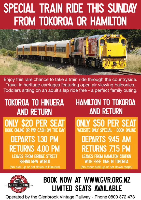 SPECIAL TRAIN RIDE THIS SUNDAY FROM TOKOROA OR HAMILTON 1254 1254 DER1254 Enjoy this rare chance to take a train ride through the countryside. Travel in heritage carriages featuring open air viewing balconies. Toddlers sitting on an adult's lap ride free - a perfect family outing. TOKOROA TO HINUERA AND RETURN HAMILTON TO TOKOROA AND RETURN ONLY $20 PER SEAT BOOK ONLINE OR PAY CASH ON THE DAY ONLY $50 PER SEAT WEBSITE ONLY SPECIAL - BOOK ONLINE DEPARTS 130 PM RETURNS 4.00 PM DEPARTS 9.45 AM RETURNS 7.15 PM LEAVES FROM BRIDGE STREET BEHIND NEW WORLD LEAVES FROM HAMILTON STATION WITH FREE TIME IN TOKOROA (No other pick up or set down stops) (No pick up or set down at Hinuera) INTAGE BOOK NOW AT WWW.GVR.ORG.NZ LIMITED SEATS AVAILABLE 1 GLENBROOK w AILWAY Operated by the Glenbrook Vintage Railway - Phone 0800 372 473 SPECIAL TRAIN RIDE THIS SUNDAY FROM TOKOROA OR HAMILTON 1254 1254 DER1254 Enjoy this rare chance to take a train ride through the countryside. Travel in heritage carriages featuring open air viewing balconies. Toddlers sitting on an adult's lap ride free - a perfect family outing. TOKOROA TO HINUERA AND RETURN HAMILTON TO TOKOROA AND RETURN ONLY $20 PER SEAT BOOK ONLINE OR PAY CASH ON THE DAY ONLY $50 PER SEAT WEBSITE ONLY SPECIAL - BOOK ONLINE DEPARTS 130 PM RETURNS 4.00 PM DEPARTS 9.45 AM RETURNS 7.15 PM LEAVES FROM BRIDGE STREET BEHIND NEW WORLD LEAVES FROM HAMILTON STATION WITH FREE TIME IN TOKOROA (No other pick up or set down stops) (No pick up or set down at Hinuera) INTAGE BOOK NOW AT WWW.GVR.ORG.NZ LIMITED SEATS AVAILABLE 1 GLENBROOK w AILWAY Operated by the Glenbrook Vintage Railway - Phone 0800 372 473