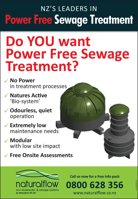 NZ'S LEADERS IN Power Free Sewage Treatment Do YOU want Power Free Sewage Treatment? No Power in treatment processes Natures Active 'Bio-system' V Odourless, quiet operation V Extremely low maintenance needs v Modular with low site impact V Free Onsite Assessments Call us now for a free info pack naturalflow 0800 628 356 eco-wastewater & sewage systems by Waterflow NZ Ltd www.naturalflow.co.nz WuCIBES-aM NZ'S LEADERS IN Power Free Sewage Treatment Do YOU want Power Free Sewage Treatment? No Power in treatment processes Natures Active 'Bio-system' V Odourless, quiet operation V Extremely low maintenance needs v Modular with low site impact V Free Onsite Assessments Call us now for a free info pack naturalflow 0800 628 356 eco-wastewater & sewage systems by Waterflow NZ Ltd www.naturalflow.co.nz WuCIBES-aM