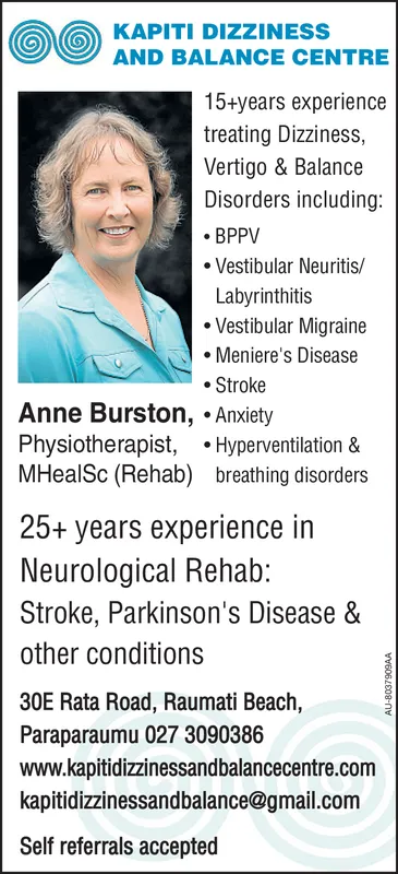 KAPITI DIZZINESS AND BALANCE CENTRE 15+years experience treating Dizziness, Vertigo & Balance Disorders including .BPPV Vestibular Neuritis/ Labyrinthitis Vestibular Migraine Meniere's Disease Stroke Anne Burston, Anxiety Physiotherapist, .Hyperventilation & MHealSc (Rehab) breathing disorders 25+ years experience in Neurological Rehab: Stroke, Parkinson's Disease & other conditions 30E Rata Road, Raumati Beach, Paraparaumu 027 3090386 www.kapitidizzinessandbalancecentre.com kapitidizzinessandbalance@gmail.com Self referrals accepted
