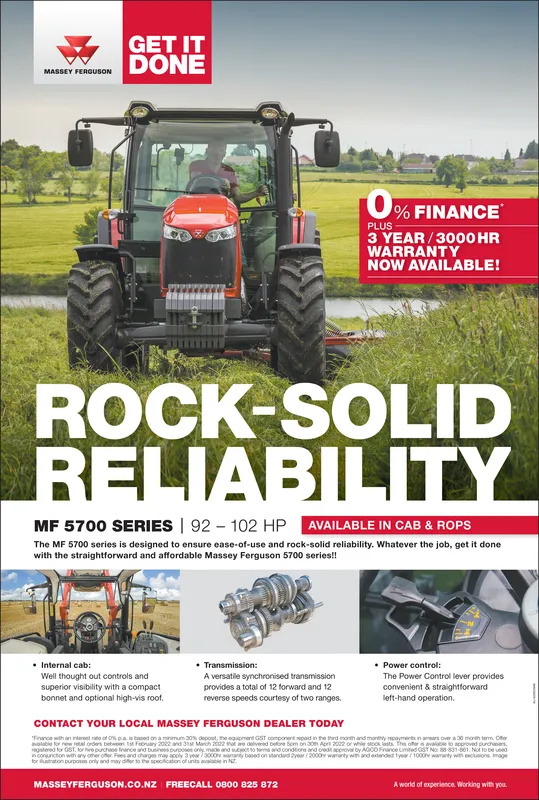 GET IT DONE MASSEY FERGUSON 0% FINANCE PLUS 3 YEAR/3000 HR WARRANTY NOW AVAILABLE! ROCK-SOLID RELIABILITY MF 5700 SERIES | 92 - 102 HP AVAILABLE IN CAB & ROPS The MF 5700 series is designed to ensure ease-of-use and rock-solid reliability. Whatever the job, get it done with the straightforward and affordable Massey Ferguson 5700 series! Internal cab: Well thought out controls and superior visibility with a compact Transmission: A versatile synchronised transmission provides a total of 12 forward and 12 Power control: The Power Control lever provides convenient & straightforward left-hand operation. bonnet and optional high-vis roof, reverse speeds courtesy of two ranges. CONTACT YOUR LOCAL MASSEY FERGUSON DEALER TODAY Trarce with an tet rate of o% s baed Oerte tor rew a puchaegstered or OST. be ued in corunction wth ary Image tor traton purposes a memum 0% dpost, te squpment GST component mpad in the trd monith and morey repaymentsnaras over a 36 month bum 2021 ard 30n Noverter 201 E aro delvered beore Som on 3tat December 2021 or whie ock ents The ofer a ovalote toacoroved made and suctoe and condtore and oredtacorov by AOCO Firance Limited GST No 68 81-01. No Foes and charges may coly 3 year/3000nanty baed on standad yer 2000v waranty with and etended tye / 100 waranty wth ecsons nd tuiness purposes and may difor to the eotcaton of untsalabein N MASSEYFERGUSON.CO.NZ FREECALL 0800 825 872 A world of experience Working with you. GET IT DONE MASSEY FERGUSON 0% FINANCE PLUS 3 YEAR/3000 HR WARRANTY NOW AVAILABLE! ROCK-SOLID RELIABILITY MF 5700 SERIES | 92 - 102 HP AVAILABLE IN CAB & ROPS The MF 5700 series is designed to ensure ease-of-use and rock-solid reliability. Whatever the job, get it done with the straightforward and affordable Massey Ferguson 5700 series! Internal cab: Well thought out controls and superior visibility with a compact Transmission: A versatile synchronised transmission provides a total of 12 forward and 12 Power control: The Power Control lever provides convenient & straightforward left-hand operation. bonnet and optional high-vis roof, reverse speeds courtesy of two ranges. CONTACT YOUR LOCAL MASSEY FERGUSON DEALER TODAY Trarce with an tet rate of o% s baed Oerte tor rew a puchaegstered or OST. be ued in corunction wth ary Image tor traton purposes a memum 0% dpost, te squpment GST component mpad in the trd monith and morey repaymentsnaras over a 36 month bum 2021 ard 30n Noverter 201 E aro delvered beore Som on 3tat December 2021 or whie ock ents The ofer a ovalote toacoroved made and suctoe and condtore and oredtacorov by AOCO Firance Limited GST No 68 81-01. No Foes and charges may coly 3 year/3000nanty baed on standad yer 2000v waranty with and etended tye / 100 waranty wth ecsons nd tuiness purposes and may difor to the eotcaton of untsalabein N MASSEYFERGUSON.CO.NZ FREECALL 0800 825 872 A world of experience Working with you.